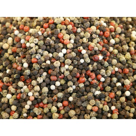 Mezcla de diferentes pimientas en grano, en proporción variable. Aroma y sabor que producen una sensación de frescura y notas picantes.